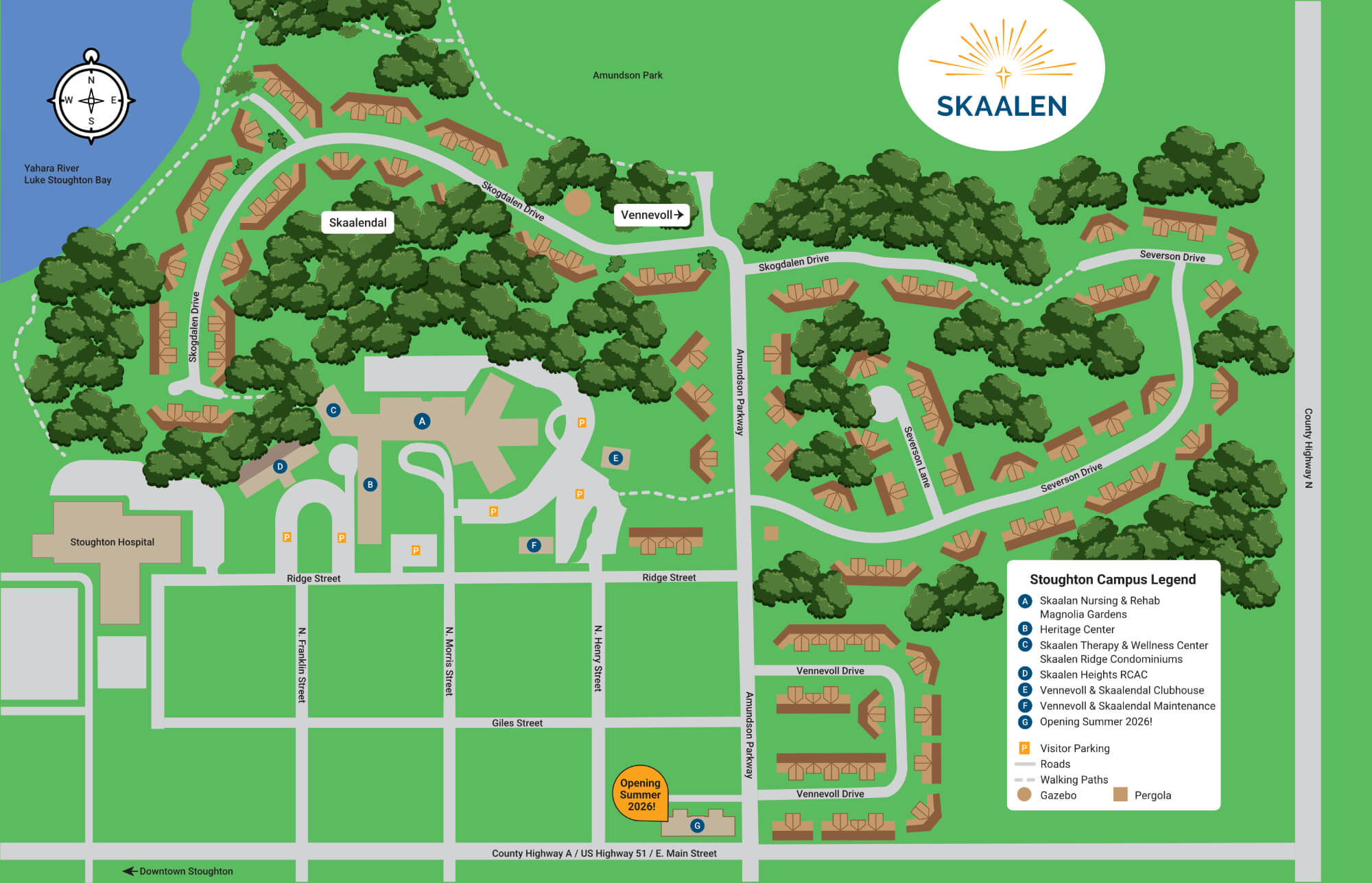 On our 10-acre McFarland Campus just 12 miles from Stoughton, are the 57 homes of our Skaalen Village community. Each low-maintenance affordable condominium offers carefree living in 1,540 to 1,570 square feet of single-level space. Each has two bedrooms, a 2-car garage, large living and dining areas, a full kitchen, and a sunroom with patio.